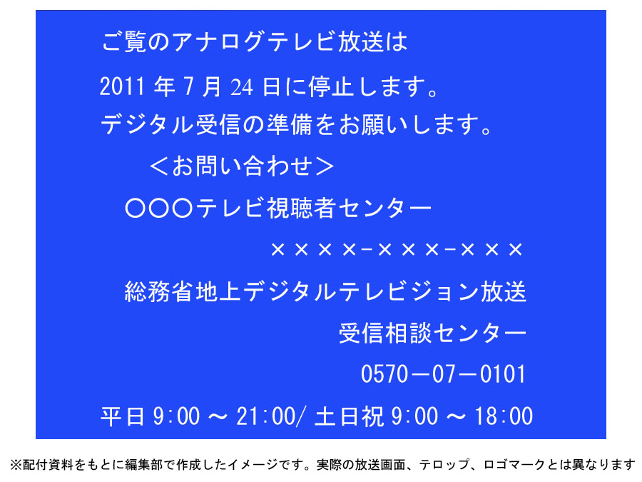 明日の正午に下の画面のようなアナログ終了の告知画面になり、23:59に砂嵐になるそうです。